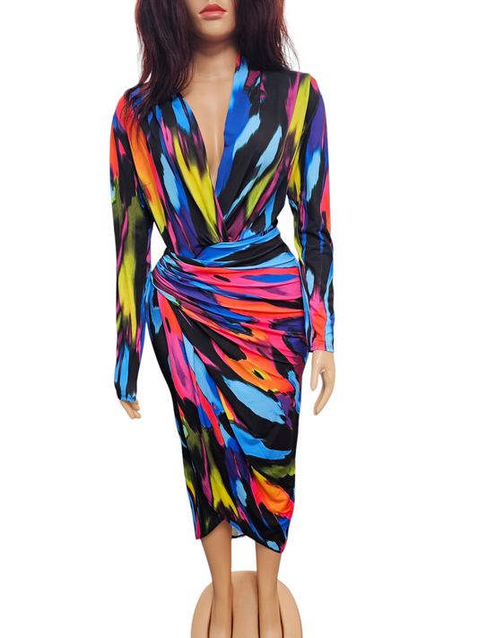Bold & Beautiful Vibrant Padded Long Sleeve Ruched Wrap Midi Dress
