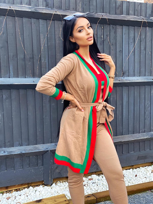 Zara Camel Tan Red and Green Striped Fine Knit 3 Piece Lounge Co-ord Set